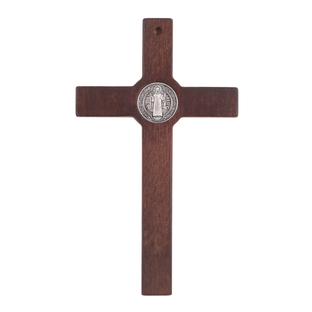 Croix de Saint Benoît en bois suspendue avec pasque bronze 28x16x1.8cm