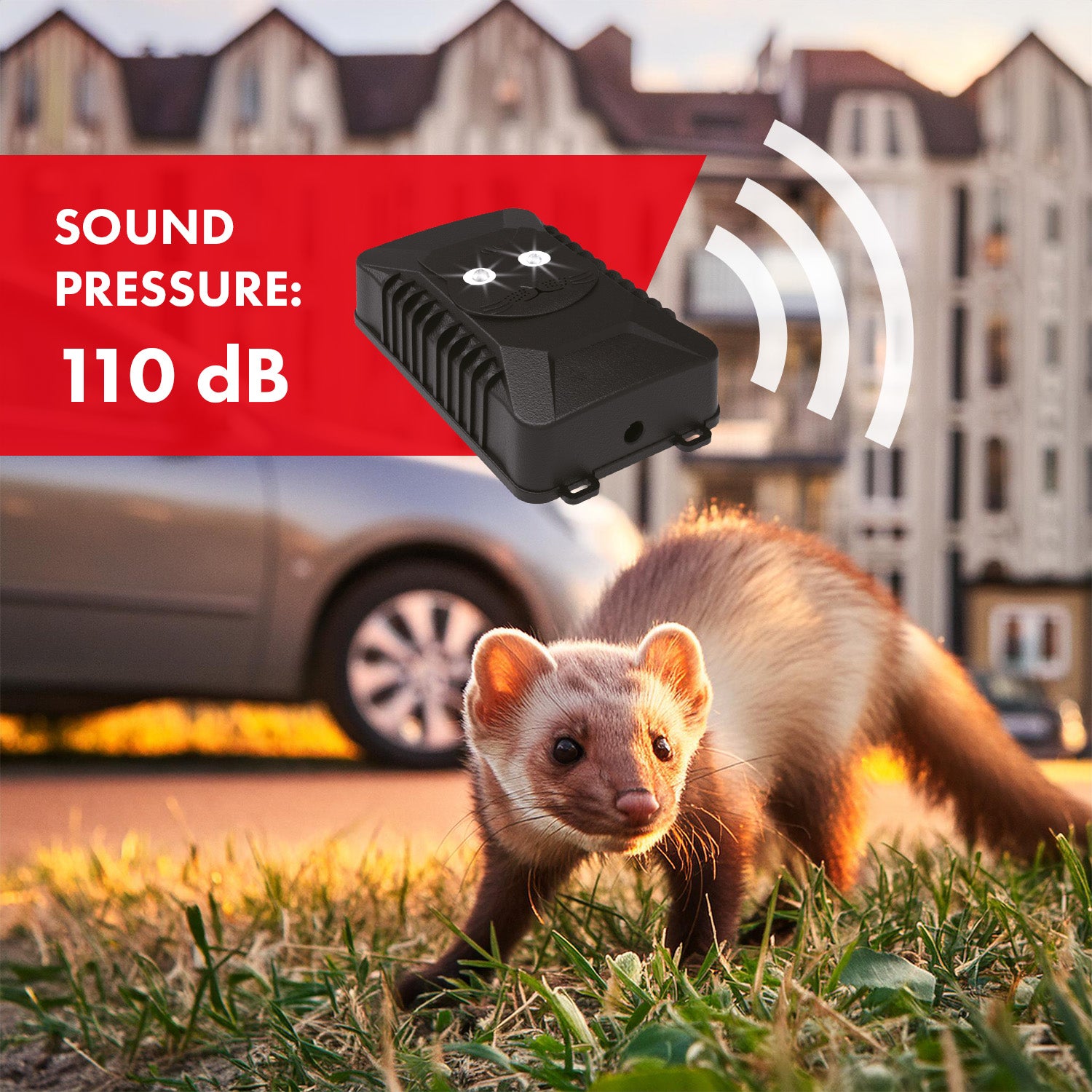 Les ultrasons à fréquence variable de 18 à 36 kHz sont inoffensifs pour les chiens, les chats et les autres animaux domestiques, tout en repoussant efficacement les rongeurs et les martres. Le répulsif peut être alimenté directement par la batterie de la voiture, par pile, et le câble USB inclus permet également d'alimenter l'appareil sur le secteur.