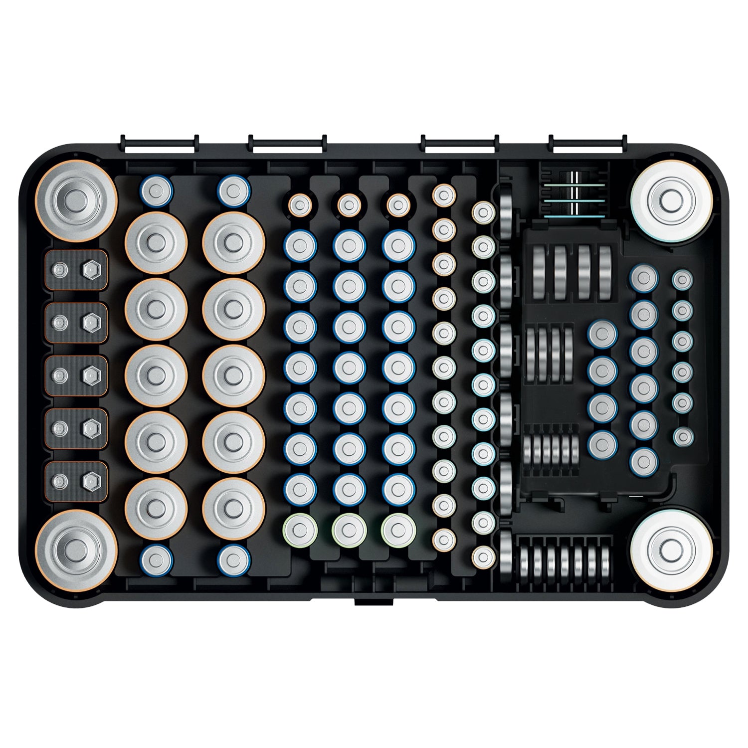 - Jusqu'à 115 emplacements de stockage pour différents types de piles