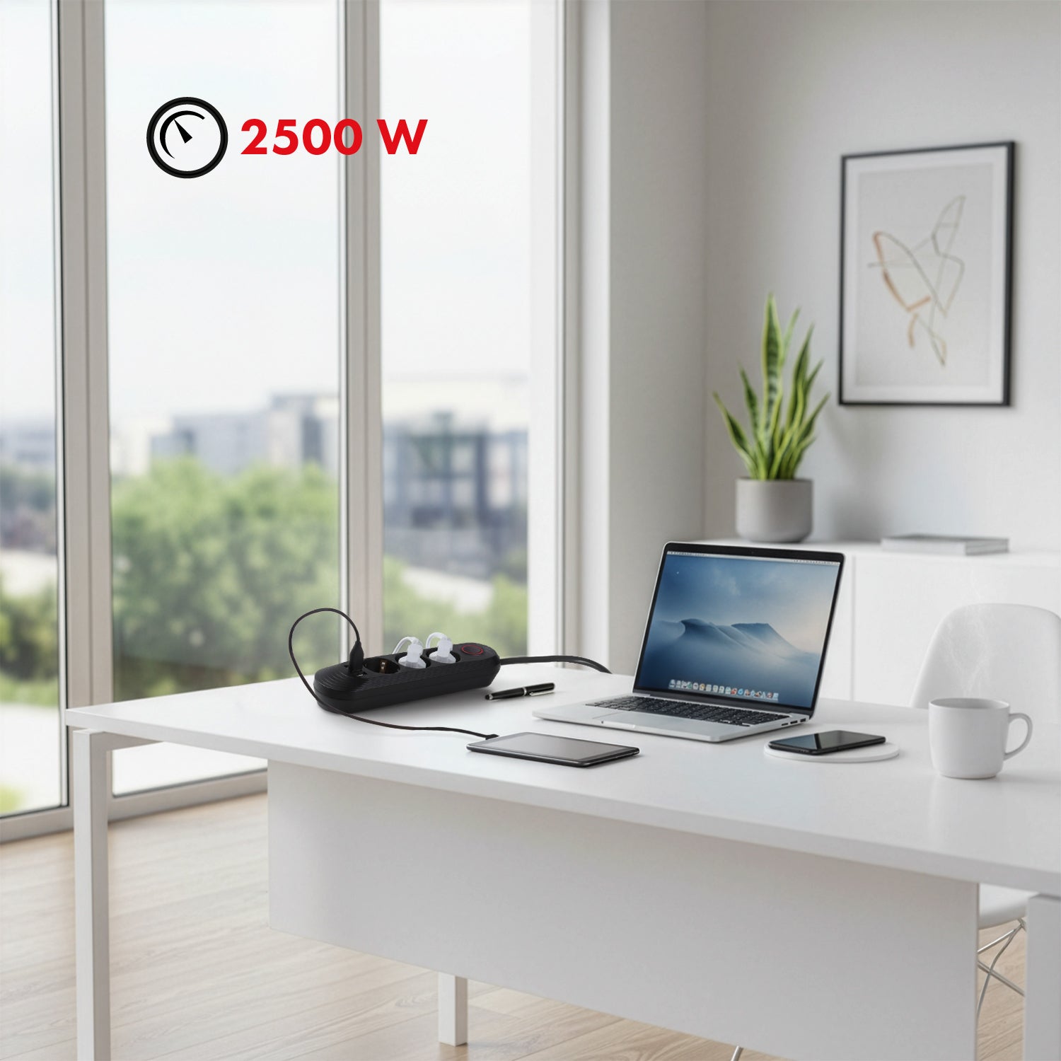 La multiprise avec 3 prises de courant et 3 ports USB est une solution idéale pour les personnes qui ont besoin d'un moyen compact mais fonctionnel d'alimenter plusieurs appareils en même temps. Avec une puissance maximale de 2 500 W et un design robuste, elle est parfaite pour une utilisation sur votre bureau, dans votre chambre ou dans votre salon. C'est un moyen fiable d'organiser les câbles et de charger commodément les équipements mobiles sans adaptateurs supplémentaires.
